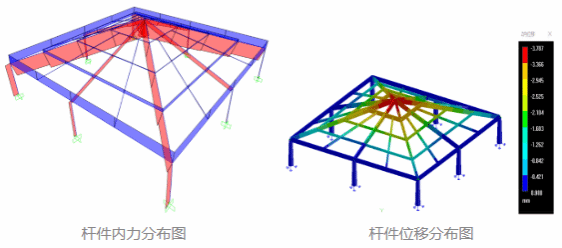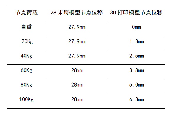 从安全角度分析,该结构强度、稳定性满足要求;从施工角度分析,该结构节点少,施工方便;从美观角度分析,屋顶下方空间预留出良好的采光、通风通道,甚至可结合照明、装饰等元素,让屋顶结构成为建筑功能与美学表达的双重载体。最终理论分析和实际加载,模型变形相互基本相同。