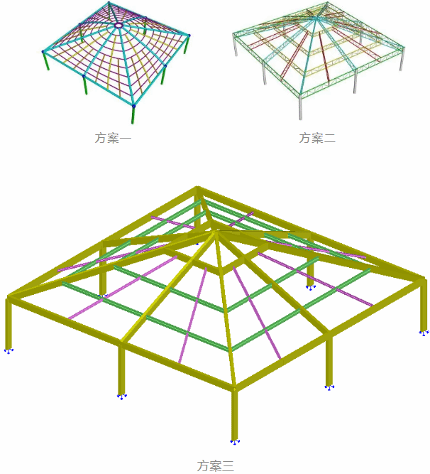 参考国内外穹顶结构设计案例,最终选择方案三,采用主次梁结构的钢框架结构,形成经线与纬线交织的穹顶结构;首先通过空间与功能融合创新,在保证结构性能的同时,为屋顶下方空间预留出良好的采光、通风通道,甚至可结合照明、装饰等元素,让屋顶结构成为建筑功能与美学表达的双重载体;其次考虑3D打印材料的填充度,堆叠性、拉压性能良好,抗拉性能较差等力学性能特点,杆件选择直线型;最后结合施工方便、快捷性,选择了杆件节点少,施工快的方案三。