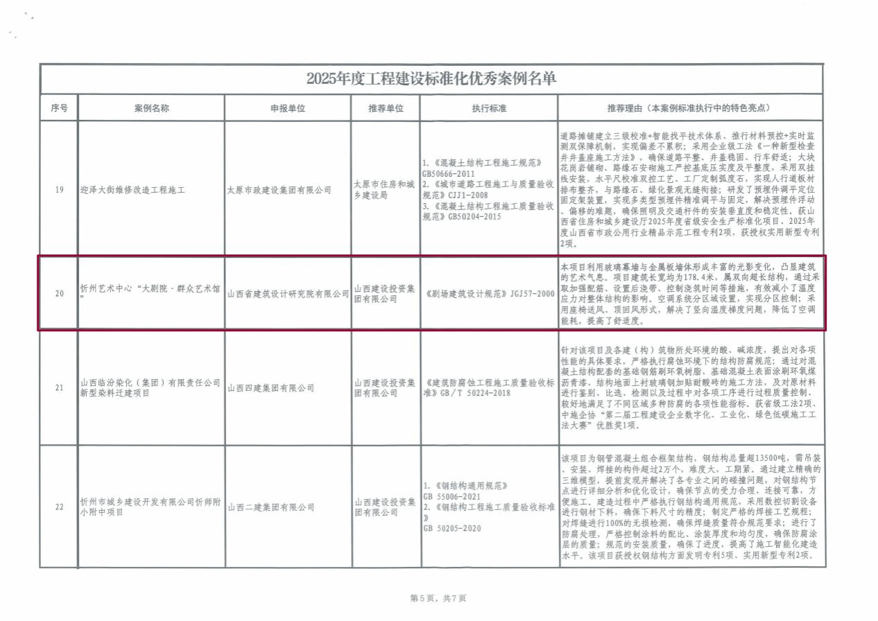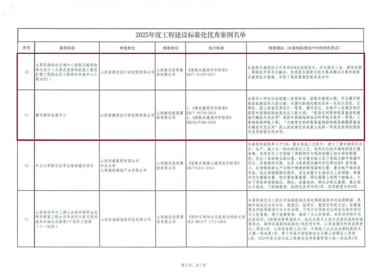 近日,山西省工程建设标准化优秀案例征集结果正式公布,我院太原武宿机场三期改扩建工程航站区工程综合交通中心工程(GTC)、潇河国际会展中心、太忻一体化经济区(大盂区)标准化厂房基础设施项目(一期)A区、山西农谷智慧冷链物流园项目、忻州艺术中心“大剧院·群众艺术馆”、山西汾酒文化商务中心东西塔楼共六个项目成功入选《2025年度工程建设标准化优秀案例名单》。