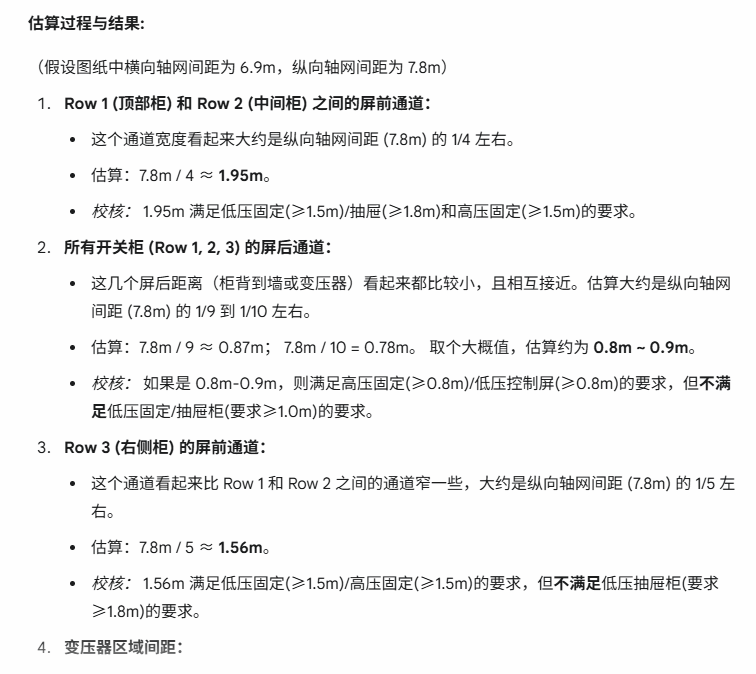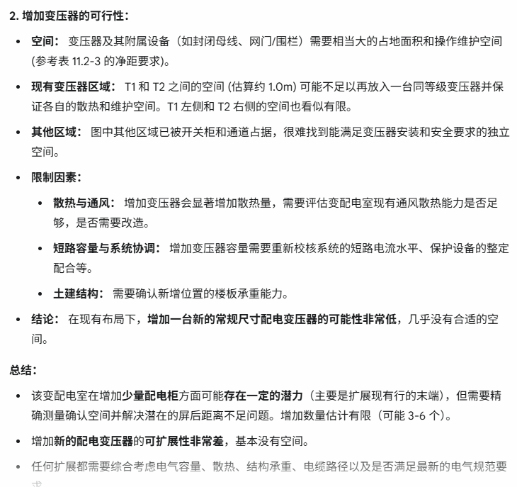 虽然现有的AI技术无法识别CAD矢量图,但利用图像识别等多模态AI技术,可以在提供规范要求、柱网尺寸后,利用AI对电气工程设计图纸进行深度扫描,找出原有图纸中设备的规格尺寸,评估工程的可拓展性。下面以一个旧变配电室为例,使用AI(google Gemini 2.5pro)评估此房间的扩展性。