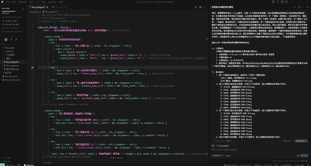 AI的发展使编程门槛大幅降低,让我们普通人也可以通过自然语言提示词(Prompt)设计一些小程序提高自己的工作效率,一些格式固定的系统图如水泵房、风机原理图等系统图可以使用固定格式的图块制作符合公司技术标准的制图插件。下面以一个消防水泵系统插件的过程为例,编写语言为lisp,IDE为Cursur(Gpt4o、Claude 3.7)。