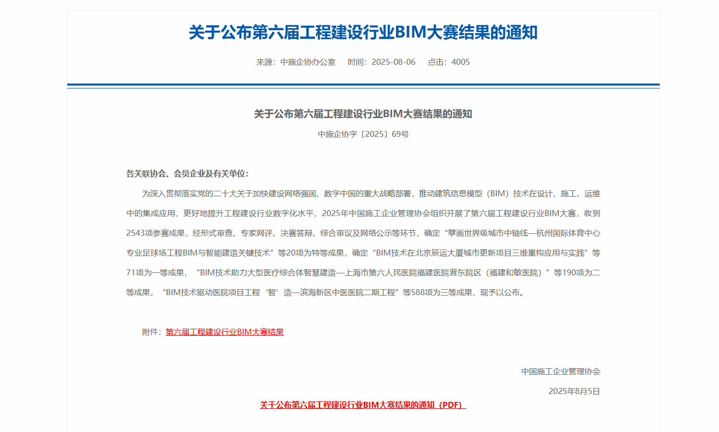 2025年中国施工企业管理协会组织开展了第六届工程建设行业BIM大赛,共有2543个项目参赛。经形式审查、专家网评、决赛答辩、综合审议及网络公示等环节,我公司与山西六建集团有限公司联合申报的《BIM+IoT驱动医院建