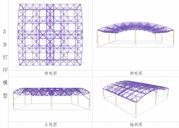 综合考量竞赛要求与实际制作条件,经济性是关键因素之一,3D打印质量也需重点关注。圆柱形网壳轻盈的特点,不仅节省材料成本,降低制作难度,还契合了竞赛对模型质量的潜在要求;而球面网壳虽刚度优越,但质量较大,可能增加制作与打印负担。经反复权衡,我们最终选定双层抽空正放四角锥圆柱形网壳作为竞赛模型,以期在满足结构性能的同时,实现经济性与制作可行性的最佳平衡。